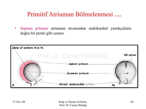 Primitif Atriumun Bölmelenmesi ... • Septum primum atriumun tavanından endokardial yastıkçıklara doğru bir perde gibi uzanır. Prof. Dr. Canan HURDAG 27-Nov-20 Kalp ve Damar Gelişimi, 64 Prof. Dr. Canan Hürdağ
