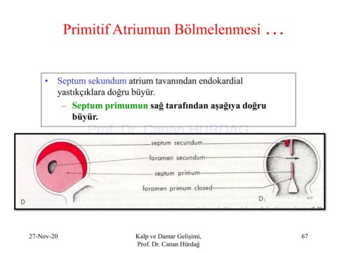 Primitif Atriumun Bölmelenmesi … • Septum sekundum atrium tavanından endokardial yastıkçıklara doğru büyür. – Septum primumun sağ tarafından aşağıya doğru büyür. Prof. Dr. Canan HURDAG 27-Nov-20 Kalp ve Damar Gelişimi, 67 Prof. Dr. Canan Hürdağ