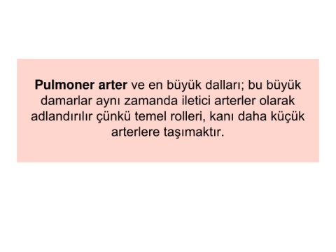 Pulmoner arter ve en büyük dalları; bu büyük damarlar aynı zamanda iletici arterler olarak adlandırılır çünkü temel rolleri, kanı daha küçük arterlere taşımaktır.