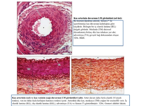 renkte), ven ise daha fazla kollajen (turuncu renkte) içerir. Arterdeki düz kas, medyaya (TM) yoğun bir eozinofili verir. İç