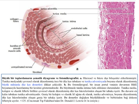 Büyük bir toplardamarın şematik diyagramı ve fotomikrografisi. a. Hücresel ve hücre dışı bileşenler etiketlenmiştir.