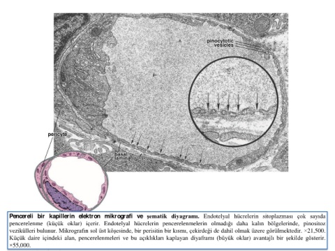 Pencereli bir kapillerin elektron mikrografi ve şematik diyagramı. Endotelyal hücrelerin sitoplazması çok sayıda
