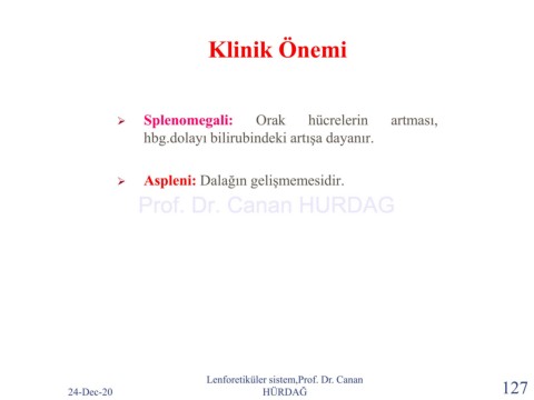 Klinik Önemi ➢ Splenomegali: Orak hücrelerin artması, hbg.dolayı bilirubindeki artışa dayanır. ➢ Aspleni: Dalağın gelişmemesidir. Prof. Dr. Canan HURDAG Lenforetiküler sistem,Prof. Dr. Canan 24-Dec-20 HÜRDAĞ 127