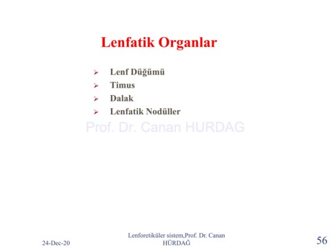 Lenfatik Organlar ➢ Lenf Düğümü ➢ Timus ➢ Dalak ➢ Lenfatik Nodüller Prof. Dr. Canan HURDAG Lenforetiküler sistem,Prof. Dr. Canan 24-Dec-20 HÜRDAĞ 56