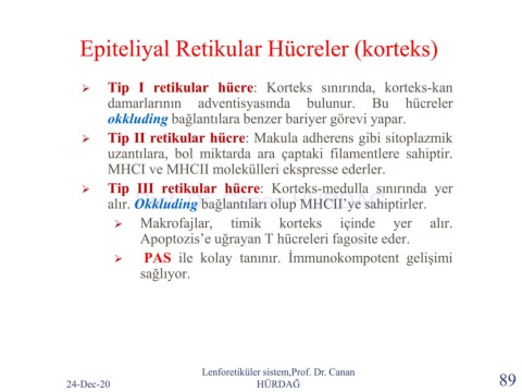 ➢ Tip I retikular hücre: Korteks sınırında, korteks-kan