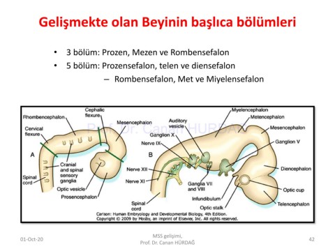 Gelişmekte olan Beyinin başlıca bölümleri • 3 bölüm: Prozen, Mezen ve Rombensefalon • 5 bölüm: Prozensefalon, telen ve diensefalon – Rombensefalon, Met ve Miyelensefalon Prof. Dr. Canan HURDAG MSS gelişimi, 01-Oct-20 42 Prof. Dr. Canan HÜRDAĞ