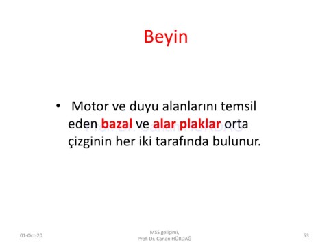 Beyin • Motor ve duyu alanlarını temsil eden bazal ve alar plaklar orta Prof. Dr. Canan HURDAG çizginin her iki tarafında bulunur. MSS gelişimi, 01-Oct-20 53 Prof. Dr. Canan HÜRDAĞ