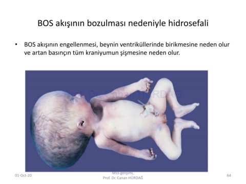 BOS akışının bozulması nedeniyle hidrosefali • BOS akışının engellenmesi, beynin ventriküllerinde birikmesine neden olur ve artan basınçın tüm kraniyumun şişmesine neden olur. Prof. Dr. Canan HURDAG MSS gelişimi, 01-Oct-20 64 Prof. Dr. Canan HÜRDAĞ