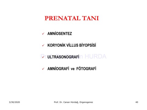 PRENATAL TANI ✓ AMNİOSENTEZ ✓ KORYONİK VİLLUS BİYOPSİSİ Prof. Dr. Canan HURDA ✓ ULTRASONOGRAFİ ✓ AMNİOGRAFİ ve FÖTOGRAFİ 3/30/2020 Prof. Dr. Canan Hürdağ, Organogenez 40