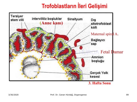 Trofoblastların İleri Gelişimi (Anne kanı) Maternal spiral A. Prof. Dr. Canan HURDA Fetal Damar . . . 3. Hafta Sonu 3/30/2020 Prof. Dr. Canan Hürdağ, Organogenez 89