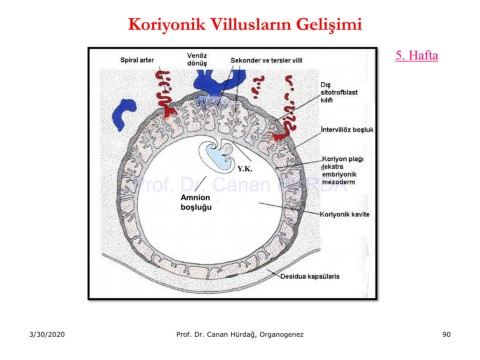 Koriyonik Villusların Gelişimi 5. Hafta Y.K. Prof. Dr. Canan HURDA Amnion boşluğu 3/30/2020 Prof. Dr. Canan Hürdağ, Organogenez 90