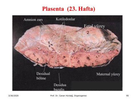 Plasenta (23. Hafta) Amnion zarı Kotiledonlar Fetal yüzey Prof. Dr. Canan HURDA Desidual Maternal yüzey bölme Desidua bazalis 3/30/2020 Prof. Dr. Canan Hürdağ, Organogenez 95