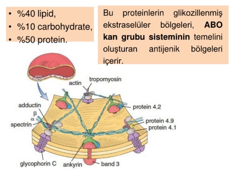 • %40 lipid, Bu proteinlerin glikozillenmiş • %10 carbohydrate, ekstraselüler bölgeleri, ABO • %50 protein. kan grubu sisteminin temelini oluşturan antijenik bölgeleri içerir.