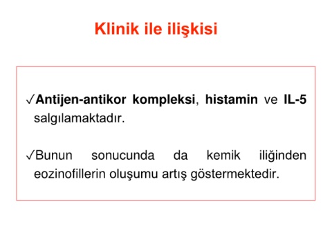 Klinik ile ilişkisi ✓Antijen-antikor kompleksi, histamin ve IL-5 salgılamaktadır. ✓Bunun sonucunda da kemik iliğinden eozinofillerin oluşumu artış göstermektedir.