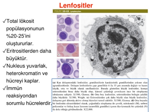 ✓İmmün agranülositlerdir. Dolaşan lenfositlerin çapı genellikle 6 ila 15 µm arasında değişir ve bazen