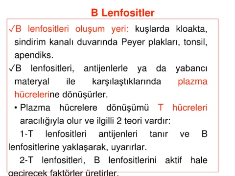 ✓B lenfositleri oluşum yeri: kuşlarda kloakta,