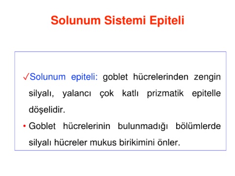 Solunum Sistemi Epiteli ✓Solunum epiteli: goblet hücrelerinden zengin silyalı, yalancı çok katlı prizmatik epitelle döşelidir. • Goblet hücrelerinin bulunmadığı bölümlerde silyalı hücreler mukus birikimini önler.