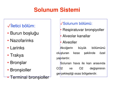 • Bronşioller CO2 ve O2 değişiminin