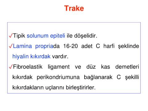 Trake ✓Tipik solunum epiteli ile döşelidir. ✓Lamina propriada 16-20 adet C harfi şeklinde hiyalin kıkırdak vardır. ✓Fibroelastik ligament ve düz kas demetleri kıkırdak perikondriumuna bağlanarak C şekilli kıkırdakların uçlarını birleştirirler.