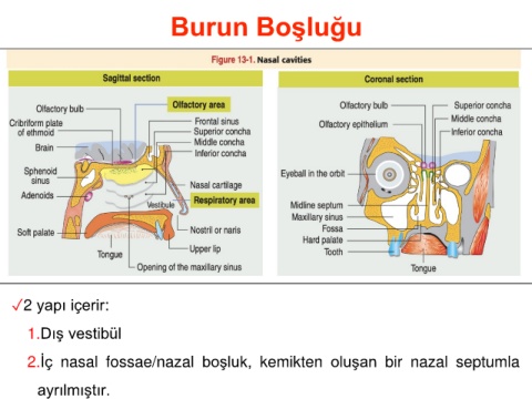 Burun Boşluğu ✓2 yapı içerir: 1.Dış vestibül 2.İç nasal fossae/nazal boşluk, kemikten oluşan bir nazal septumla ayrılmıştır.