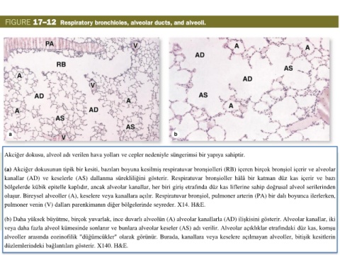 (a) Akciğer dokusunun tipik bir kesiti, bazıları boyuna kesilmiş respiratuvar bronşiolleri (RB) içeren birçok bronşiol içerir ve alveolar