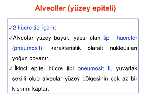 ✓Alveolar yüzey büyük, yassı olan tip I hücreler