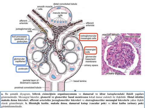 olarak gösterilmiştir. b. Histolojik kesitte, makula densa, damarsal kutup (vascular pole) ve idrar kutbu (urinary pole)