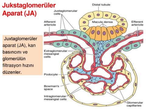 Jukstaglomerüler Aparat (JA) Juxtaglomerüler aparat (JA), kan basıncını ve glomerülün filtrasyon hızını düzenler.