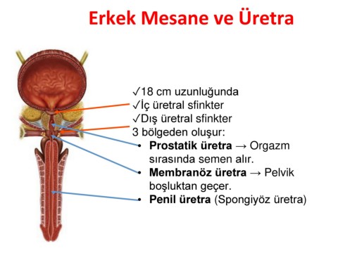 Erkek Mesane ve Üretra ✓18 cm uzunluğunda ✓İç üretral sfinkter ✓Dış üretral sfinkter 3 bölgeden oluşur: • Prostatik üretra → Orgazm sırasında semen alır. • Membranöz üretra → Pelvik boşluktan geçer. • Penil üretra (Spongiyöz üretra)