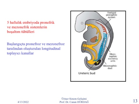 5 haftalık embriyoda pronefrik ve mezonefrik sistemlerin boşaltım tübülleri Başlangıçta pronefroz ve mezonefroz tarafından oluşturulan longitudinal toplayıcı kanallar Üriner Sistem Gelişimi 4/13/2022 Prof. Dr. Canan HÜRDAĞ 13