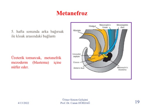 Metanefroz 5. hafta sonunda arka bağırsak ile kloak arasındaki bağlantı Üreterik tomurcuk, metanefrik mezoderm (blastema) içine nüfüz eder. Üriner Sistem Gelişimi 4/13/2022 Prof. Dr. Canan HÜRDAĞ 19