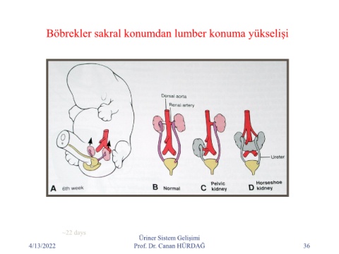 Böbrekler sakral konumdan lumber konuma yükselişi ~22 days Üriner Sistem Gelişimi 4/13/2022 Prof. Dr. Canan HÜRDAĞ 36