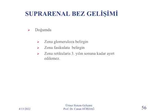 SUPRARENAL BEZ GELİŞİMİ ➢ Doğumda ➢ Zona glomeruloza belirgin ➢ Zona fasikulata belirgin ➢ Zona retikularis 3. yılın sonuna kadar ayırt edilemez. Üriner Sistem Gelişimi 4/13/2022 Prof. Dr. Canan HÜRDAĞ 56