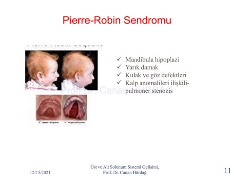 Pierre-Robin Sendromu Mandibula hipoplazi Yarık damak Kulak ve göz defektleri Kalp anomalileri ilişkili- pulmoner stenozis Prof. Dr. Canan HURDAG Üst ve Alt Solunum Sistemi Gelişimi, 12/15/2021 Prof. Dr. Canan Hürdağ 11