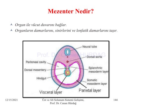 Mezenter Nedir? Organ ile vücut duvarını bağlar. Organların damarlarını, sinirlerini ve lenfatik damarlarını taşır. Prof. Dr. Canan HURDAG 12/15/2021 Üst ve Alt Solunum Sistemi Gelişimi, 144 Prof. Dr. Canan Hürdağ