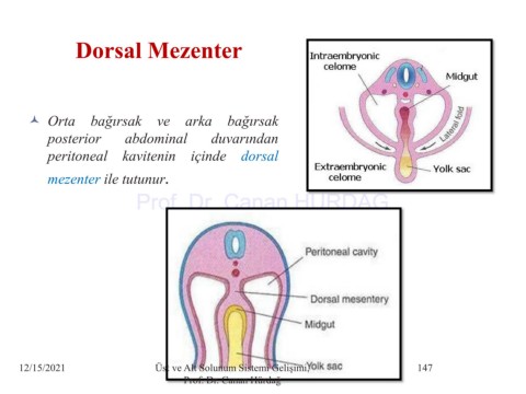 Dorsal Mezenter Orta bağırsak ve arka bağırsak posterior abdominal duvarından peritoneal kavitenin içinde dorsal mezenter ile tutunur. Prof. Dr. Canan HURDAG 12/15/2021 Üst ve Alt Solunum Sistemi Gelişimi, 147 Prof. Dr. Canan Hürdağ