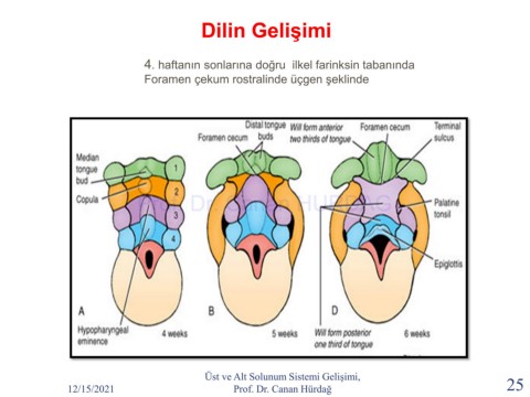 Dilin Gelişimi 4. haftanın sonlarına doğru ilkel farinksin tabanında Foramen çekum rostralinde üçgen şeklinde Prof. Dr. Canan HURDAG Üst ve Alt Solunum Sistemi Gelişimi, 12/15/2021 Prof. Dr. Canan Hürdağ 25
