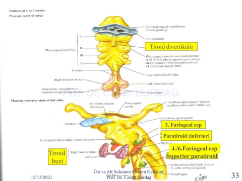 Tiroid divertikülü Prof. Dr. Canan HURDAG 3. Faringeal cep Paratiroid (inferior) 4./6.Faringeal cep Tiroid Superior paratiroid bezi Üst ve Alt Solunum Sistemi Gelişimi, 12/15/2021 Prof. Dr. Canan Hürdağ 33