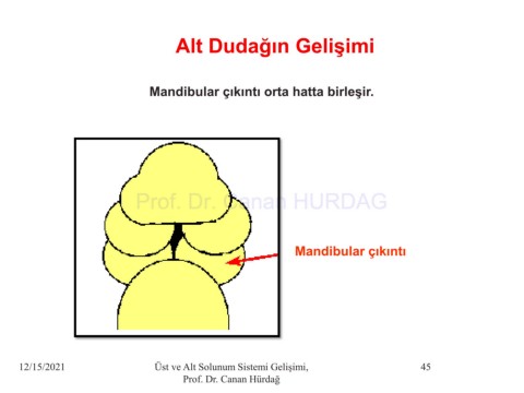 Alt Dudağın Gelişimi Mandibular çıkıntı orta hatta birleşir. Prof. Dr. Canan HURDAG Mandibular çıkıntı 12/15/2021 Üst ve Alt Solunum Sistemi Gelişimi, 45 Prof. Dr. Canan Hürdağ