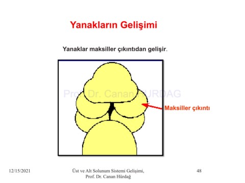 Yanakların Gelişimi Yanaklar maksiller çıkıntıdan gelişir. Prof. Dr. Canan HURDAG Maksiller çıkıntı 12/15/2021 Üst ve Alt Solunum Sistemi Gelişimi, 48 Prof. Dr. Canan Hürdağ