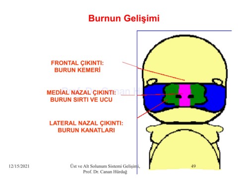 Burnun Gelişimi FRONTAL ÇIKINTI: BURUN KEMERİ Prof. Dr. Canan HURDAG MEDİAL NAZAL ÇIKINTI: BURUN SIRTI VE UCU LATERAL NAZAL ÇIKINTI: BURUN KANATLARI 12/15/2021 Üst ve Alt Solunum Sistemi Gelişimi, 49 Prof. Dr. Canan Hürdağ