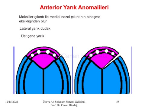 Anterior Yarık Anomalileri Maksiller çıkıntı ile medial nazal çıkıntının birleşme eksikliğinden olur Lateral yarık dudak Üst çene yarık Prof. Dr. Canan HURDAG 12/15/2021 Üst ve Alt Solunum Sistemi Gelişimi, 58 Prof. Dr. Canan Hürdağ