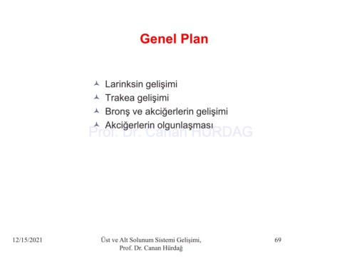 Genel Plan Larinksin gelişimi Trakea gelişimi Bronş ve akciğerlerin gelişimi Akciğerlerin olgunlaşması Prof. Dr. Canan HURDAG 12/15/2021 Üst ve Alt Solunum Sistemi Gelişimi, 69 Prof. Dr. Canan Hürdağ
