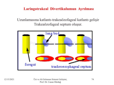 Laringotrakeal Divertikulumun Ayrılması Uzunlamasına katlantı-trakeaözofageal katlantı gelişir Trakeaözofageal septum oluşur. Prof. Dr. Canan HURDAG 12/15/2021 Üst ve Alt Solunum Sistemi Gelişimi, 74 Prof. Dr. Canan Hürdağ