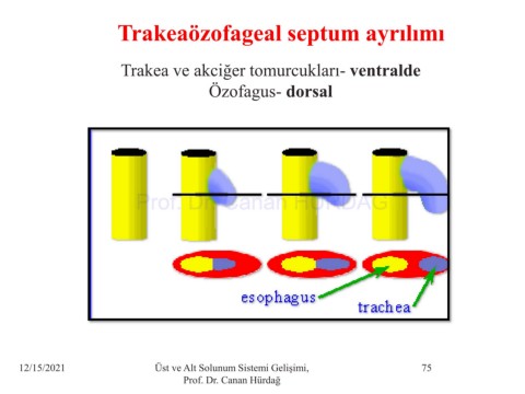 Trakeaözofageal septum ayrılımı Trakea ve akciğer tomurcukları- ventralde Özofagus- dorsal Prof. Dr. Canan HURDAG 12/15/2021 Üst ve Alt Solunum Sistemi Gelişimi, 75 Prof. Dr. Canan Hürdağ