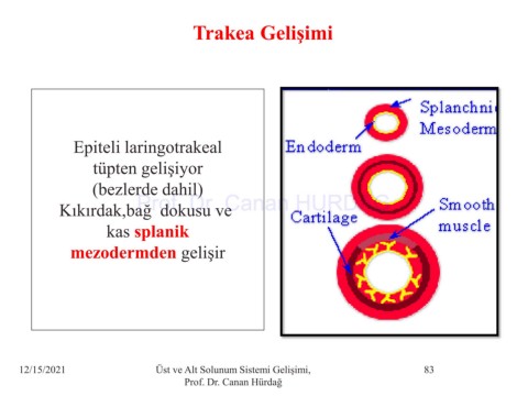 Trakea Gelişimi Epiteli laringotrakeal tüpten gelişiyor (bezlerde dahil) Prof. Dr. Canan HURDAG Kıkırdak,bağ dokusu ve kas splanik mezodermden gelişir 12/15/2021 Üst ve Alt Solunum Sistemi Gelişimi, 83 Prof. Dr. Canan Hürdağ