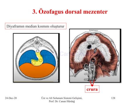 3. Özofagus dorsal mezenter Diyaframın median kısmını oluşturur Prof. Dr. Canan HURDAG crura 24-Dec-20 Üst ve Alt Solunum Sistemi Gelişimi, 128 Prof. Dr. Canan Hürdağ