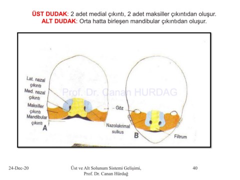 ÜST DUDAK: 2 adet medial çıkıntı, 2 adet maksiller çıkıntıdan oluşur. ALT DUDAK: Orta hatta birleşen mandibular çıkıntıdan oluşur. Prof. Dr. Canan HURDAG 24-Dec-20 Üst ve Alt Solunum Sistemi Gelişimi, 40 Prof. Dr. Canan Hürdağ
