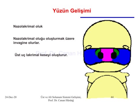 Yüzün Gelişimi Nazolakrimal oluk Nazolakrimal oluğu oluşturmak üzere invagine olurlar. Prof. Dr. Canan HURDAG Üst uç lakrimal keseyi oluşturur. 24-Dec-20 Üst ve Alt Solunum Sistemi Gelişimi, 44 Prof. Dr. Canan Hürdağ