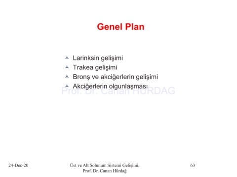 Genel Plan Larinksin gelişimi Trakea gelişimi Bronş ve akciğerlerin gelişimi Akciğerlerin olgunlaşması Prof. Dr. Canan HURDAG 24-Dec-20 Üst ve Alt Solunum Sistemi Gelişimi, 63 Prof. Dr. Canan Hürdağ